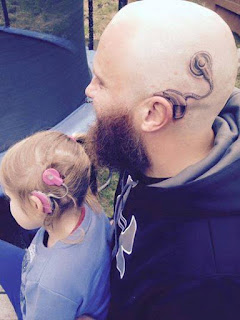 | Charlotte Campbell age 6 with her dad Alistair who had a cochlear implant tattooed on his head to support Charlotte who is deaf. |