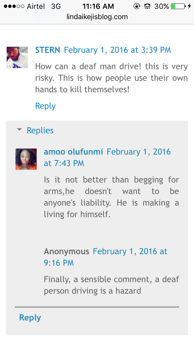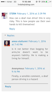 This is one of the problems we, Deaf people are facing in a NONCHALANT SOCIETY. There was a lot of drama during my driving in Lagos state, I have been driving since 2011 and I have had so many encounters with police men, FRSC and VIO officers at different times.There was a time, a police man found out that I am deaf, he was angry, he asked me to get out of car and asked how come I am driving when I can’t hear, I told him, how come I graduated with my masters degree when I can’t hear (I know it was kind of an embarrassment for him). When I was driving from Lagos to Ibadan, in the middle of the road, one of FRSC officers stopped me, and he seized my driver license when he found out that I couldn't hear, he said I must explain how I obtained my driver’s license, it was so annoying that day.