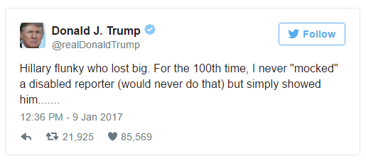 You talked of how President elect Trump mocked a Disabled reporter, i am afraid you might have been following medias that are biased, i was like you until i found out that they were full of bias, and you see why Hillary was complaining against media when she lost to Trump. The media said Trump mocked a Disabled reporter but President-elect Donald Trump denied mocking a reporter for a physical disability in a series of tweets. For him to deny, he means well for Deaf community.